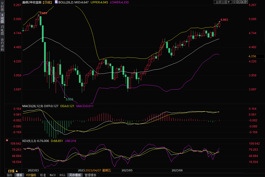 通常与利率预期同步变动的两年期美国国债收益率周一上涨5.7个基点,报4.934%,盘中最高触及4.963%,为近四个月新高。
