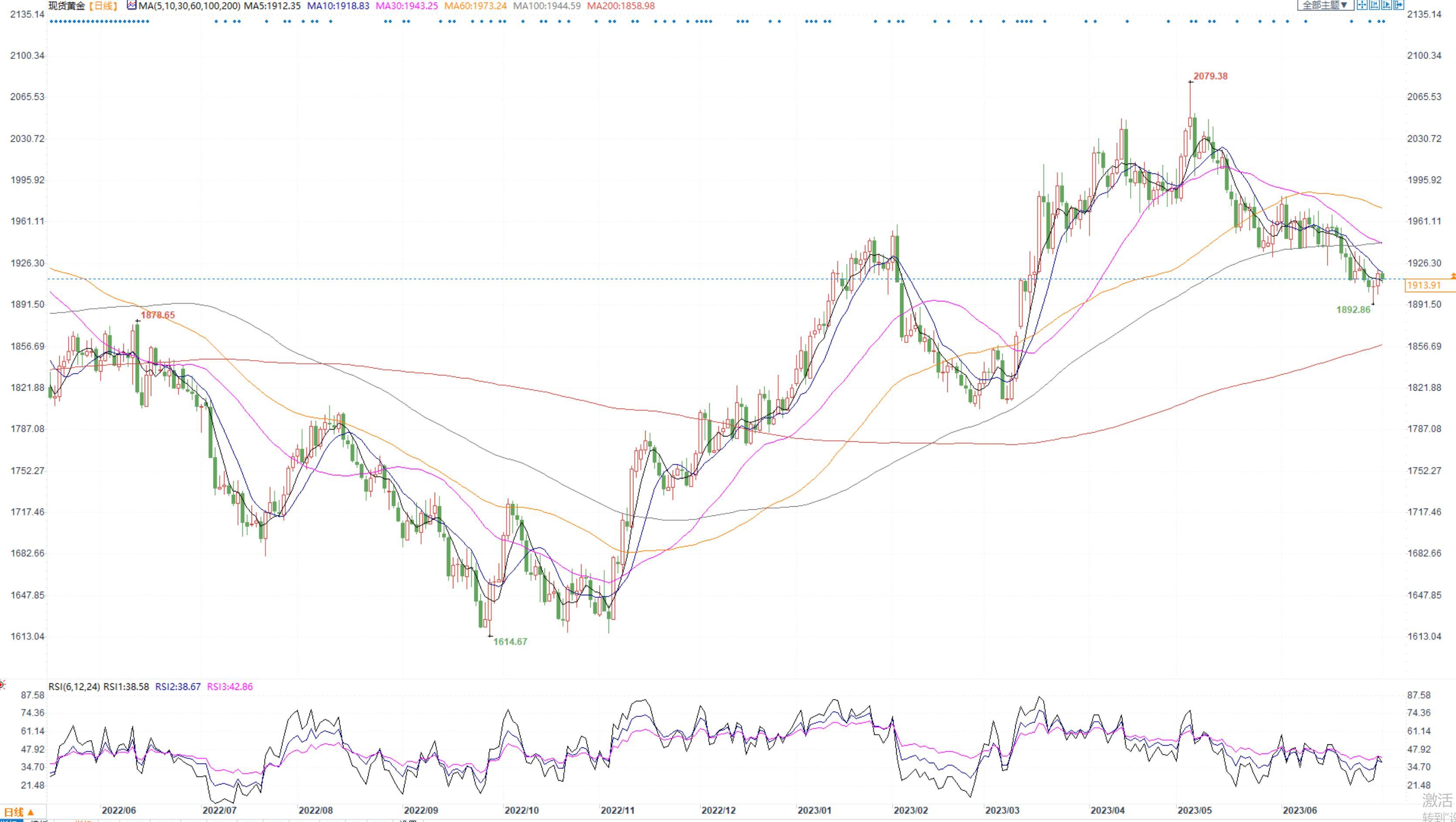 美元指数小幅回涨。此前的系列美国经济数据显示美国消费者支出有所降温,使得市场对美联储鹰派加息的激进程度存疑。据美国商务部公布的数据显示,5月核心PCE通胀同比略低于预期,环比从0.4%回落至0.3%,同比增速小幅回落至4.6%,但仍高于美联储制定的通胀目标。数据公布后金价上涨,市场对美联储7月继续加息的预期概率略有所降低,但目前仍处高位。短期内金银或暂维持偏弱震荡,等待后续系列经济数据公布以及美联储7月FOMC会议决议。操作上建议,短线偏空思路为主。