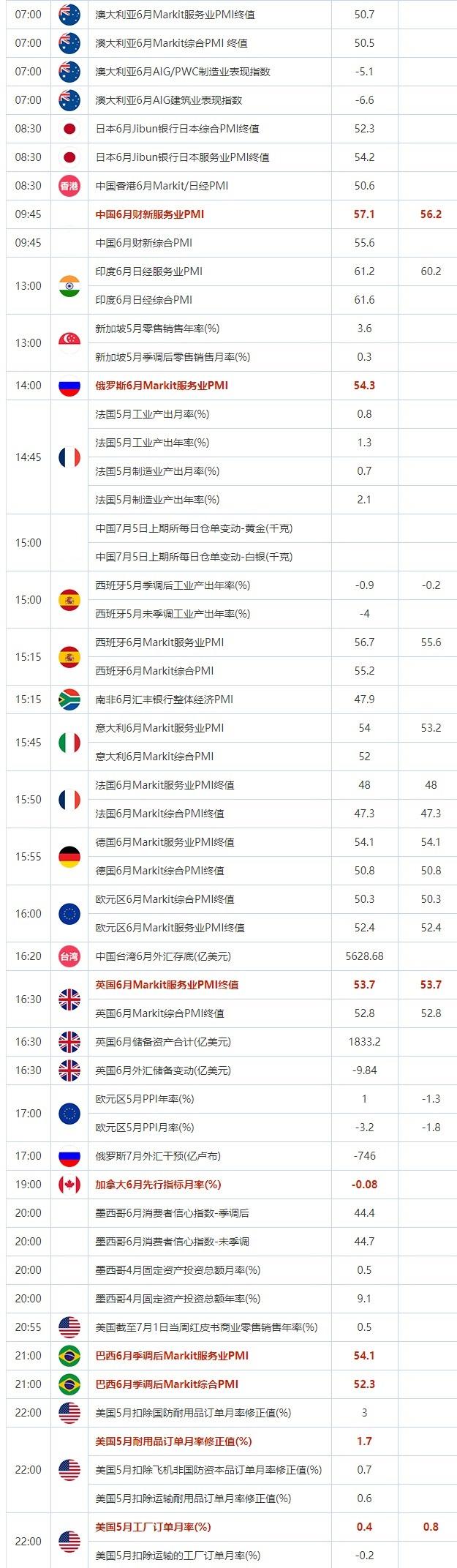 09:45 中国6月财新服务业PMI , 前值 57.1 , 预期值 56.2 , 公布值:待发布09:45 中国6月财新综合PMI , 前值 55.6 , 预期值 -- , 公布值:待发布