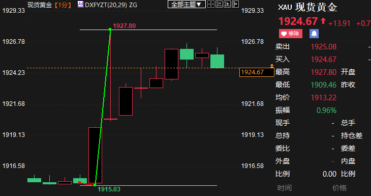 现货黄金跳涨逾12美元至1927.80美元/盎司。