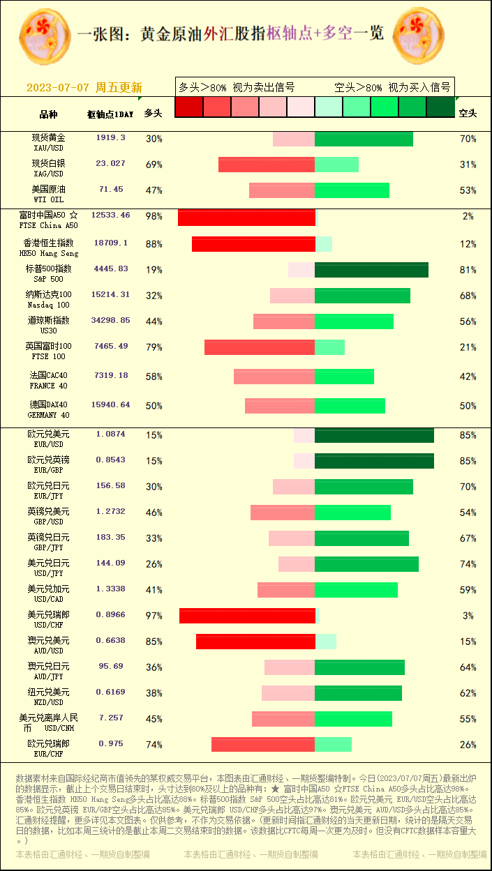 标题:一张图:2023/07/07黄金原油外汇股指"枢纽点+多空占比"一览