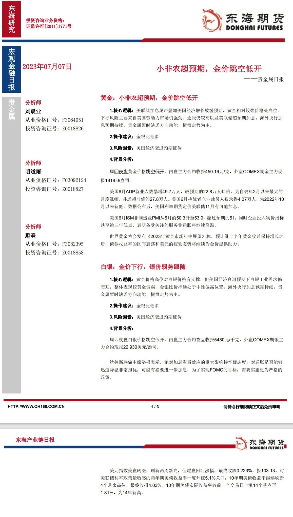 标题:【东海期货7月7日产业链日报】贵金属篇:小非农超预期,金价跳空低开