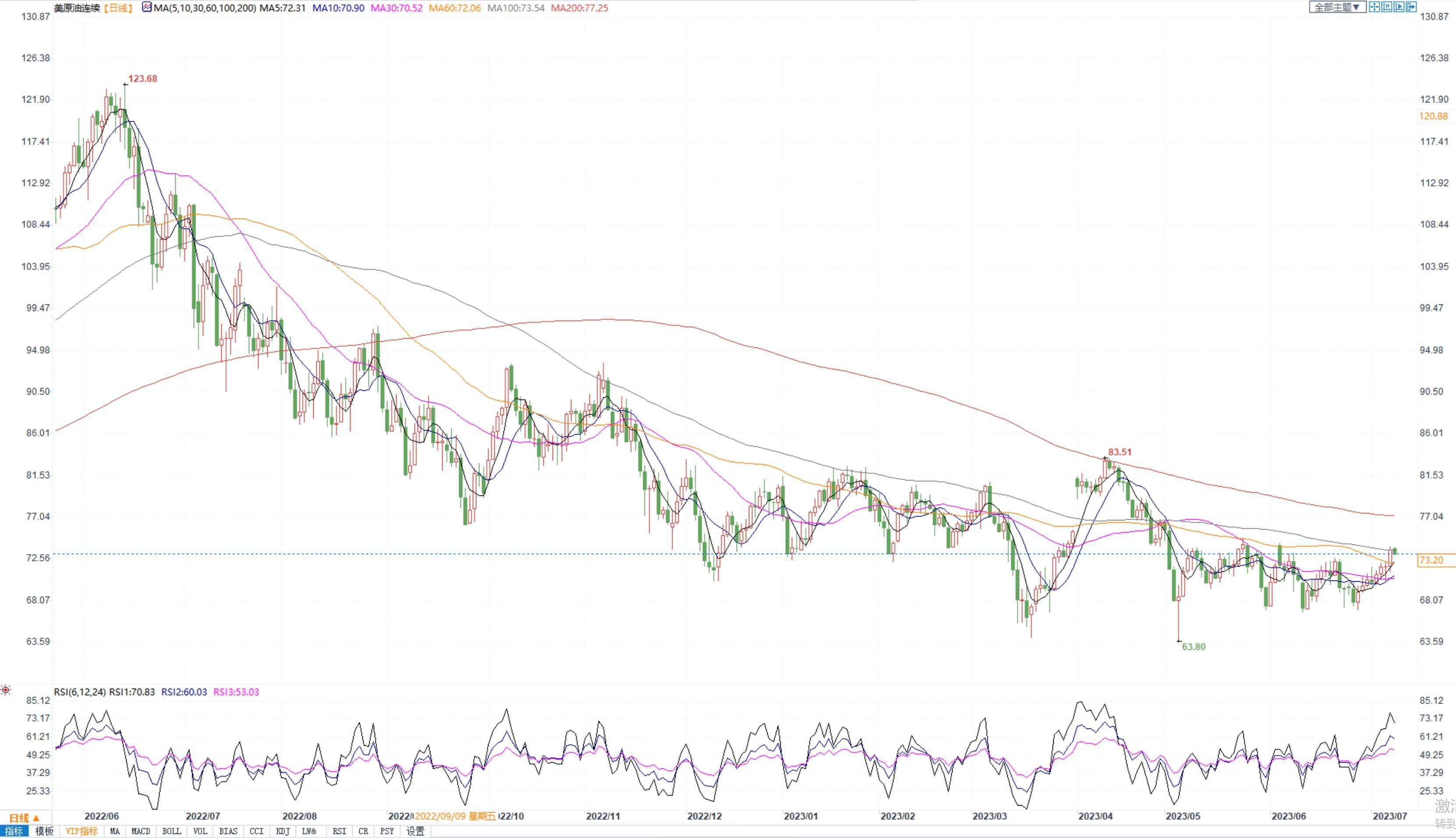 周一国内原油价格继续震荡上涨。供应收紧担忧超过对进一步加息可能放缓经济增长并减少石油需求的担忧,预计欧佩克及其减产同盟国将收紧市场,推动2023年下半年石油市场供不应求,支撑油价上涨。通用电气公司的油田服务机构贝克休斯公布的数据显示,截止7月7日的一周,美国在线钻探油井数量540座,为2022年4月以来的最低水平,比前周减少5座;比去年同期减少57座。美国能源信息署数据显示,截止6月30日当周,美国原油日均产量1240万桶,比前周日均产量增加20万桶。美国能源信息署数据显示,截止2023年6月30日当周,包括战略储备在内的美国原油库存总量7.99341亿桶,比前一周下降296.6万桶;美国商业原油库存量4.52182亿桶,比前一周下降150.8万桶;美国汽油库存总量2.19456亿桶,比前一周下降255万桶;馏分油库存量为1.13366亿桶,比前一周下降104.5万桶。美国石油战略储备已经降至3.472亿桶的近40年来低点。美国能源部周五表示,正在寻求为战略石油储备再购买600万原油,因为美国战略石油储备在去年创纪录的释放后,美国能源部继续寻求重新填充战略石油储备。技术面,油价中长期维持震荡反弹。操作建议:震荡偏多思路操作。