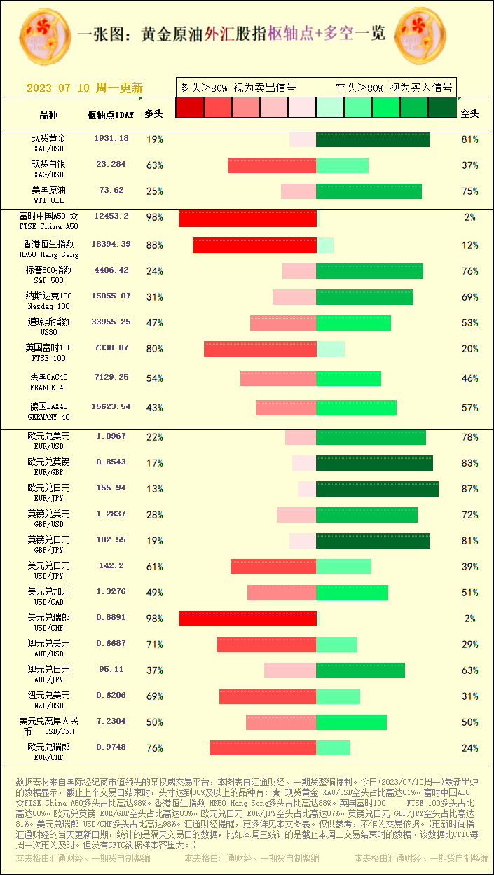 标题:一张图:2023/07/10黄金原油外汇股指"枢纽点+多空占比"一览