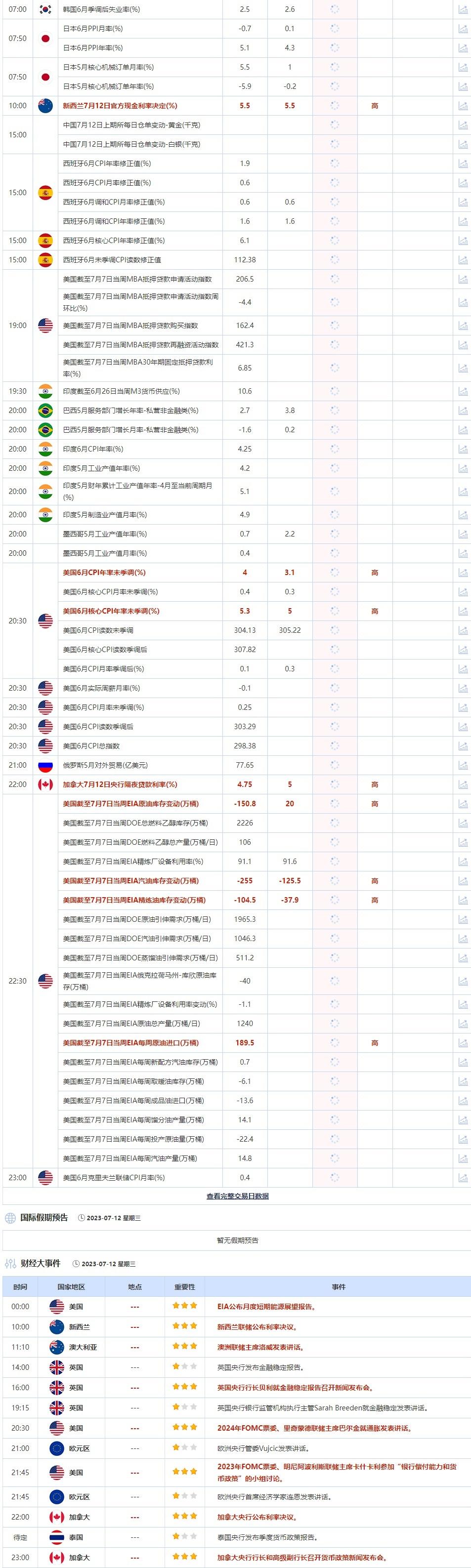 20:30 美国6月核心CPI年率未季调(%) , 前值 5.3 , 预期值 5 , 公布值:待发布20:30 美国6月CPI读数未季调 , 前值 304.13 , 预期值 305.22 , 公布值:待发布