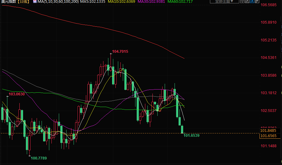 以上发言拖累美元兑一篮子货币触及两个月最低的101.66,交易员降低了对美国利率可能需要进一步上调的预期。