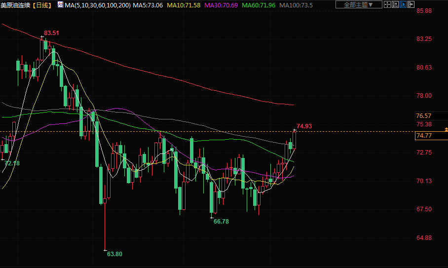 布伦特原油期货结算价报每桶79.40美元,上涨2.2%。美国原油期货上涨2.5%,结算价报74.83美元。