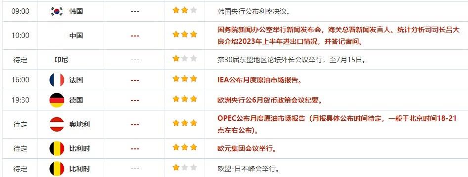 09:00 韩国7月央行公布利率决议(%) , 前值 3.5 , 预期值 3.5 , 公布值:待发布