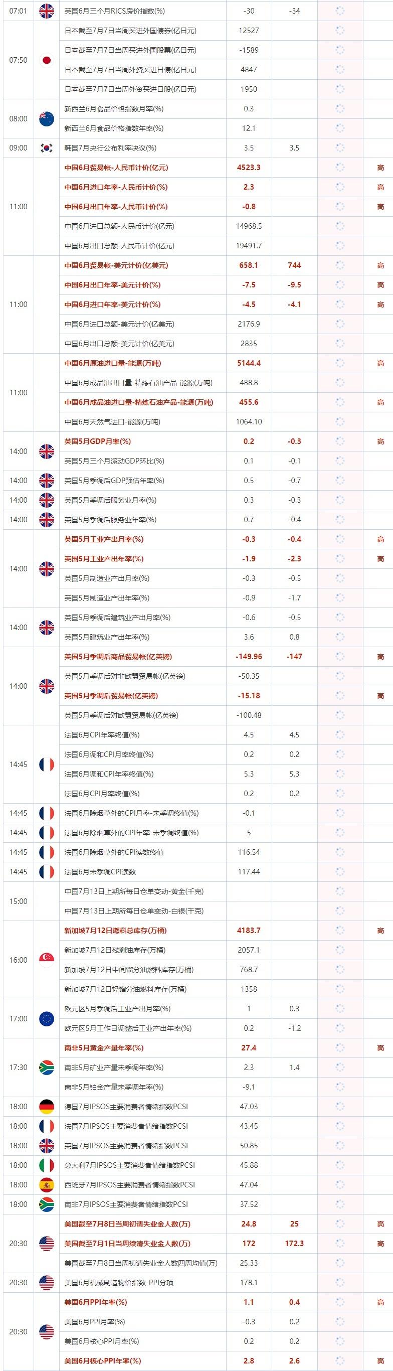 11:00 中国6月贸易帐-人民币计价(亿元) , 前值 4523.3 , 预期值 -- , 公布值:待发布11:00 中国6月进口年率-人民币计价(%) , 前值 2.3 , 预期值 -- , 公布值:待发布