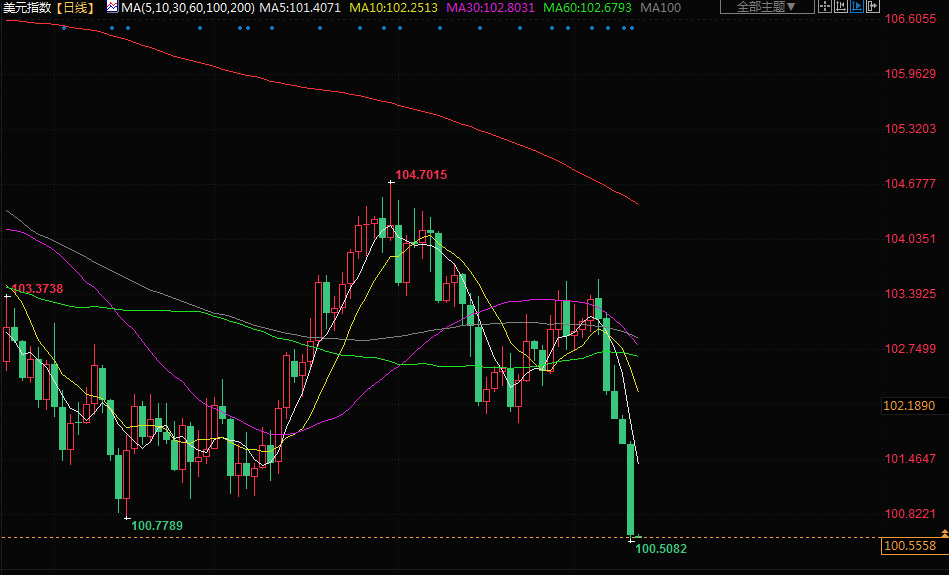 美元指数一度触及100.54的2022年4月以来最低,盘尾下跌1%,报100.55,势将创下2月初以来最大单日百分比跌幅。