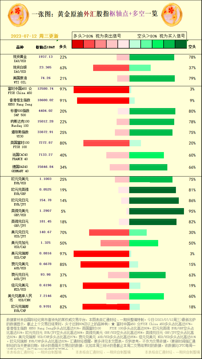 标题:一张图:2023/07/12黄金原油外汇股指"枢纽点+多空占比"一览