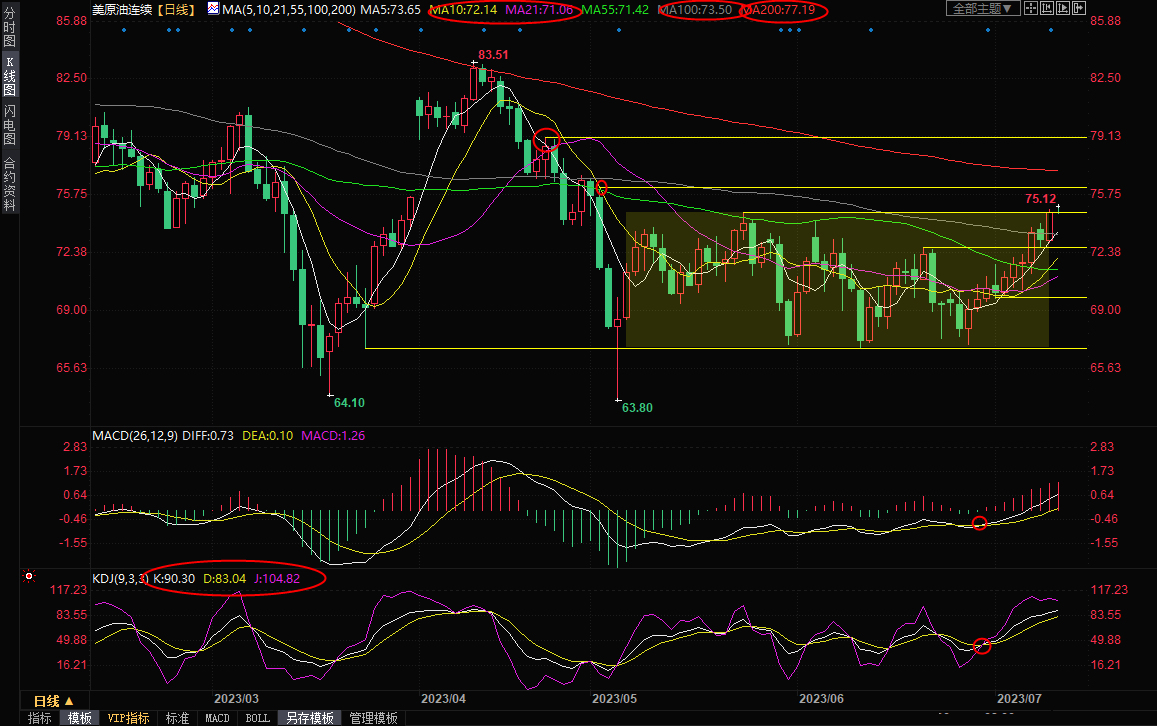 日线级别:震荡上涨;MACD金叉且初步上穿零轴,KDJ金叉,短期均线多头排列,10日均线上穿55日均线,油价顶破100日均线,5日均线上穿100日均线,油价短线仍偏向多头,目前正初步向上突破近两个月的震荡区间,布林线初步开口,后市有望延布林线上轨向上运行,上方初步阻力参考5月2日高点76.09附近阻力,较强的阻力在200日均线77.19附近,若能顶破该阻力,则增加后市看涨信号;进一步阻力参考4月24日高点79.15和80整数关口。