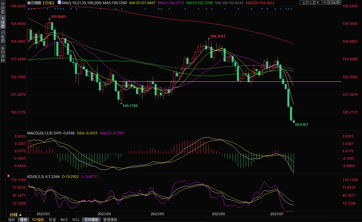 周五亚市,美元指数延续跌势,一度创2002年4月中旬以来新低至99.63,此前美元指数连续五个交易日下跌,将创下2023年以来的最大单周跌幅,因为美国通胀降温提振了美联储今年将仅再加息一次的预期,从而削弱了美元对比其他货币的收益率优势。