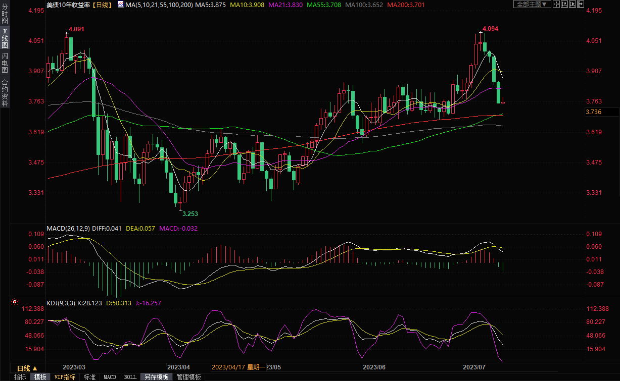 美国10年期国债收益率周四跌至两周低点,两年期国债收益率降至6月中旬以来最低,因美国通胀放缓,提振了对美联储在本月晚些时候加息25个基点后将停止加息的押注。