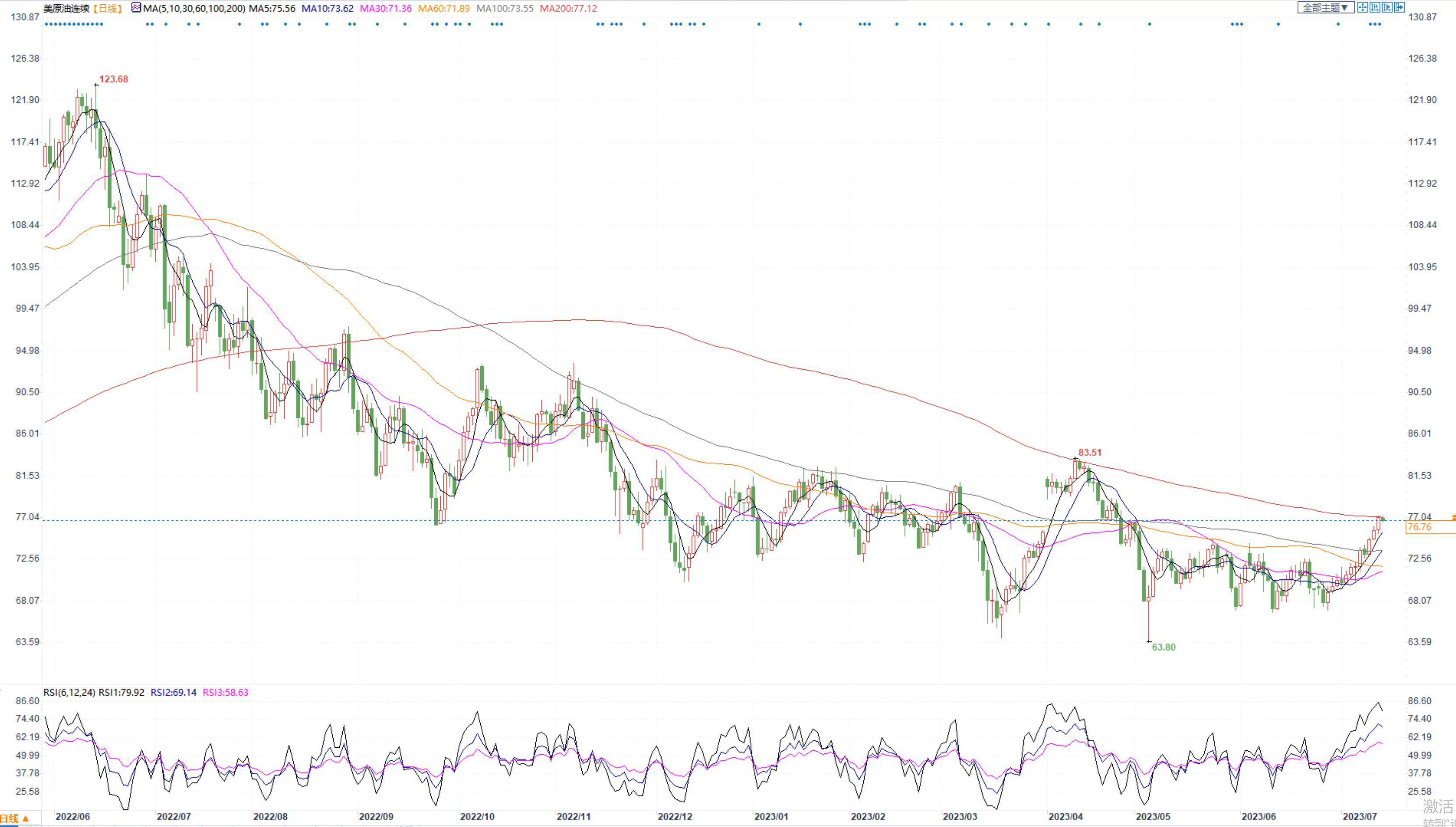 周五国内原油价格继续小幅震荡上涨。尽管美国商业原油库存增长,然而美国通胀数据激发了人们对美联储可能不会加息的希望,国际油价继续上涨。美国劳工部周三公布的数据显示,美国6月底季调消费者价格指数年率增长3%,上月为增长4%,市场预期为增长3.1%。美国能源信息署数据显示,截至7月7日的一周,美国战略储备原油库存为1983年8月以来的最低水平。拜登政府继续实施补充战略石油储备的计划,美国能源部7月7日宣布计划回购约600万桶含硫原油。周四国际能源署发布了7月份《石油市场月度报告》。国际能源署数据显示,6月份,俄罗斯石油日均出口量730万桶,环比下降了60万桶,为2021年3月以来最低水平。欧佩克发布了7月份《石油市场月度报告》。报告指出,由于中国第二季度石油需求增长,欧佩克五个月来首次上调2023年全球石油需求增长预测。报告预测2023年全球石油日均需求1.02亿桶,同比增长244万桶,比上月报告预测上调了9万桶。技术面,油价中长期维持震荡上涨。操作建议:震荡偏多思路操作。