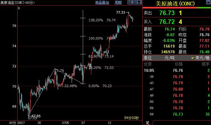 小时图上看,NYMEX原油自70.23美元开启上行iii浪走势,上看161.8%目标位77.85美元。iii浪是自67.05美元开启的(iii)浪的子浪。日线上看,(iii)浪上看100%目标位在78.47美元。