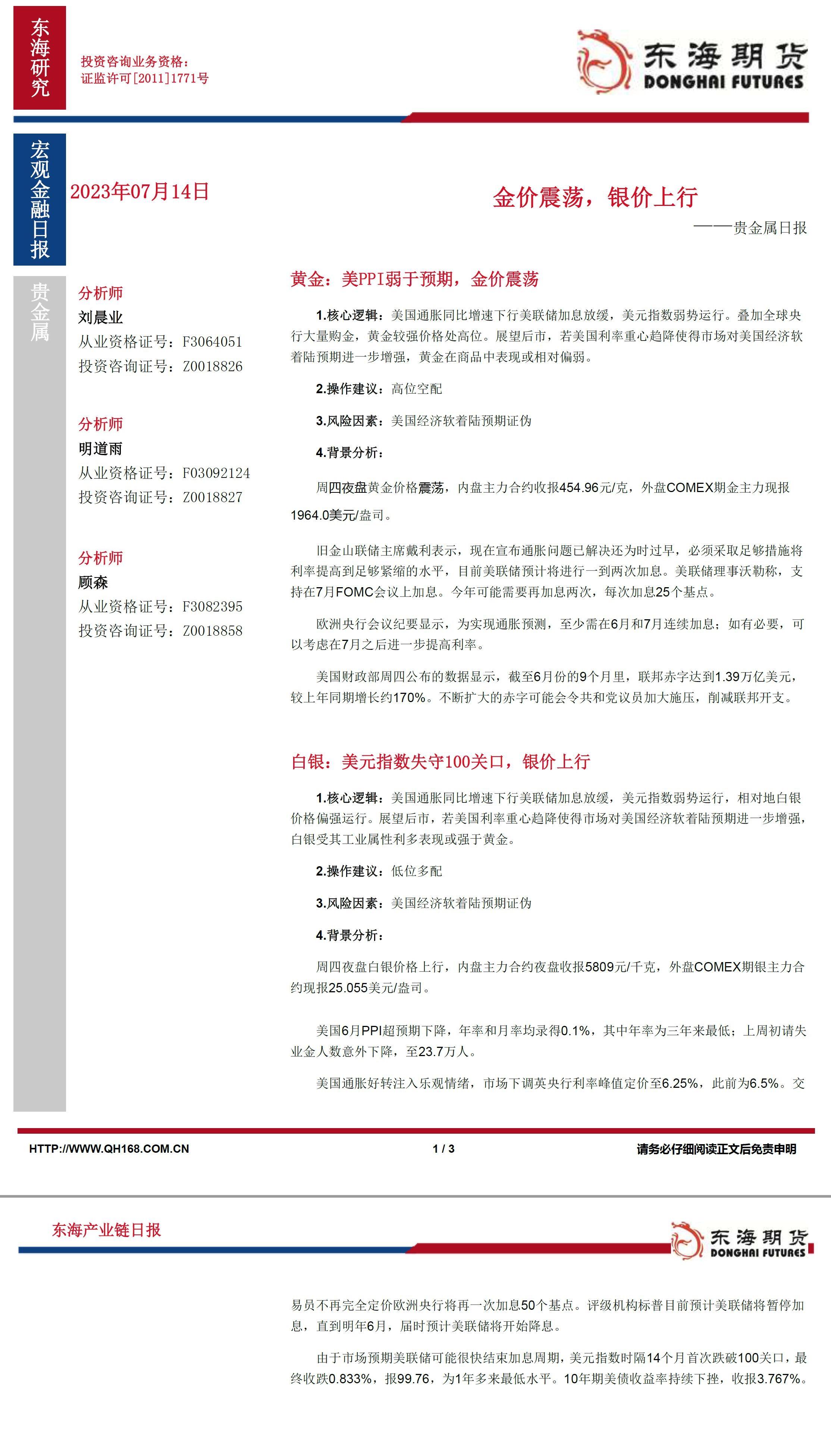 标题:【东海期货7月14日产业链日报】贵金属篇:金价震荡,银价上行
