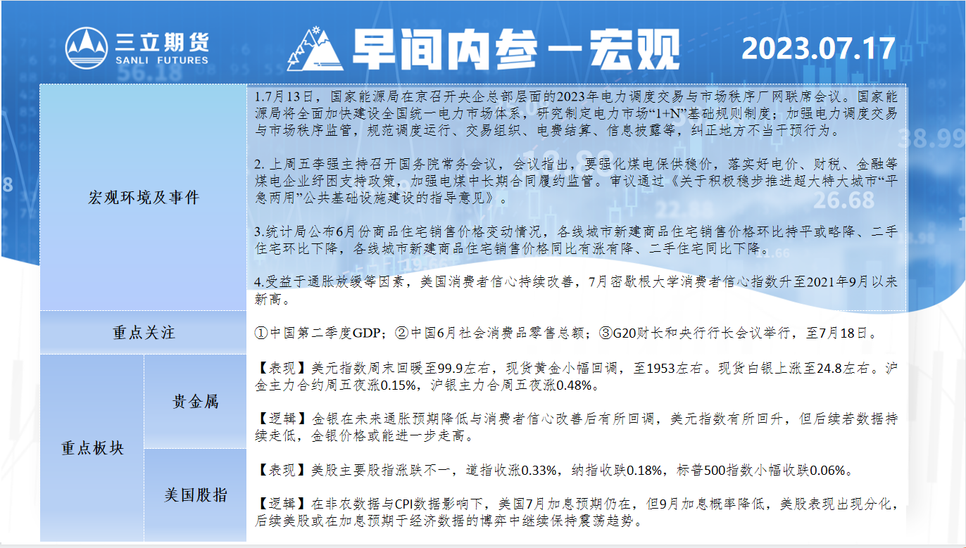 三立期货7月17日早间内参——宏观