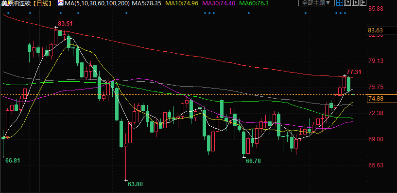 美原油交投于74.90美元/桶附近,油价上周五回落近2.5%,因美元走强,石油交易商在强劲反弹后获利了结,美国东北部遭遇强风暴短期影响需求限制油价涨幅。
