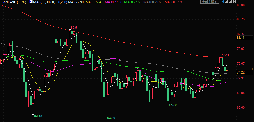 美原油交投于74.14美元/桶附近,油价周一下跌逾1.5%,市场对需求担忧有所增加,利比亚生产部分重启,也令油价承压。