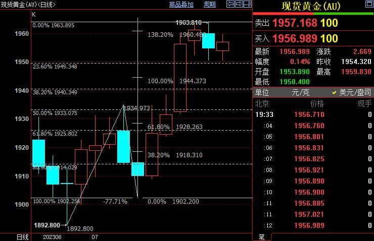 现货黄金上浮0.10%至1957.19美元/盎司;COMEX期金主力合约下跌0.16%至1961.3美元/盎司;