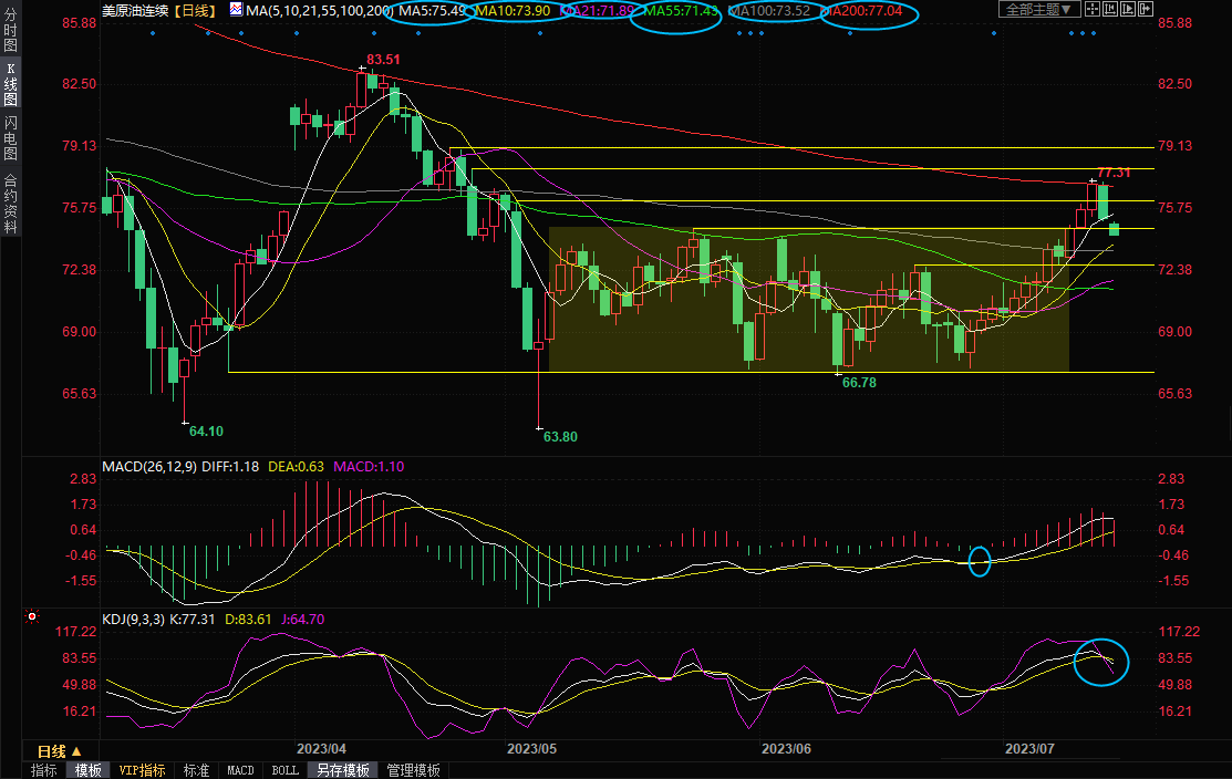 由于MACD金叉信号仍在,在失守100日均线73.52前,后市油价仍有继续冲高的机会,初步阻力参考5日均线74.49附近,5月2日高点阻力在76.09附近,200日均线阻力目前在77.04附近,若能强势顶破该阻力,则有望打开新的上涨通道。