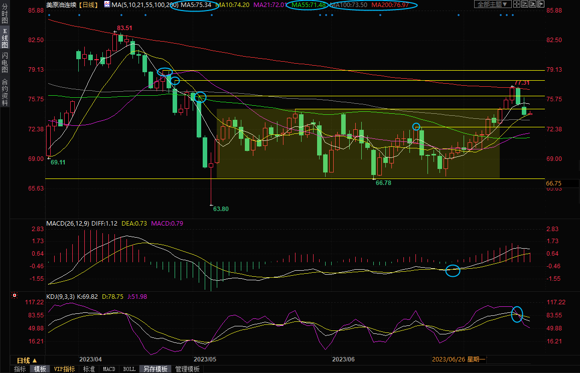 震荡;油价在200日均线附近受阻后持续回落,而且在该强阻力附近还形成了“吞没”看空K线组合后油价延续跌势,KDJ死叉运行,增强了短线见顶信号,油价后市面临进一步下行风险,初步支撑参考100日均线73.50附近位置,进一步支撑参考6月21日高点72.68附近位置,55日均线支撑目前在71.48附近,若失守该支撑,则增加后市看空信号。