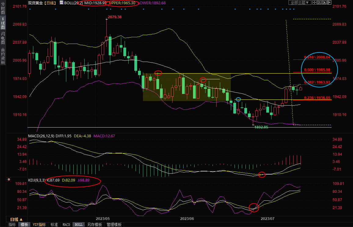 震荡上涨;KDJ金叉迹象向上发散,MACD金叉运行且初步上穿零轴,布林线轻微开口,金价后市有望沿布林线上轨向上运行,初步目标位参考1985.98附近,该位置是2079-1892跌势的50%回撤位所在,5月24日触及的近两个月高点阻力也再该位置附近,进一步目标位参考61.8%回撤位2008.04附近位置;短线的话,38.2%回撤位1963.93、6月9日高点1972.85和1980关口附近也分别存在一定的阻力。