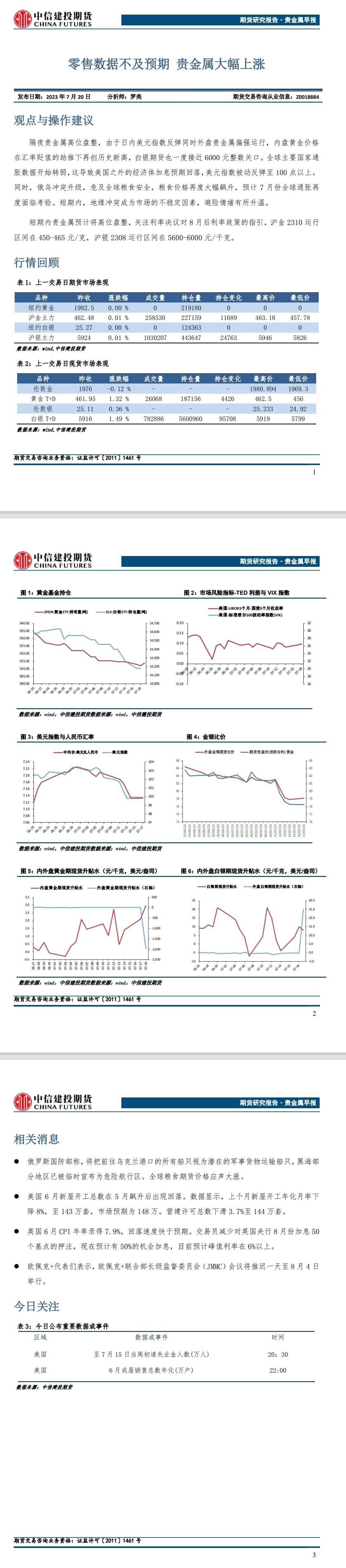 标题:中信建投期货7月20日贵金属早报:零售数据不及预期 贵金属大幅上涨
