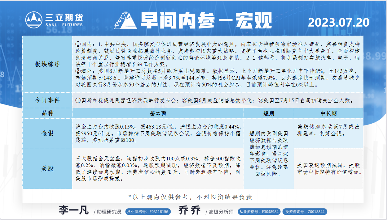 三立期货7月20日早间内参——宏观