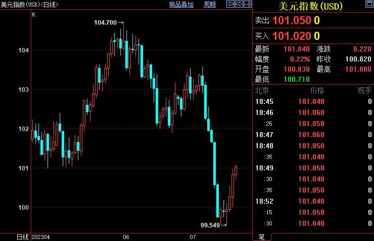 美元指数上涨1.07%至101.025。两者盘中分别创5月17日以来新高1987.34美元/盎司和4月11日以来新低99.550。