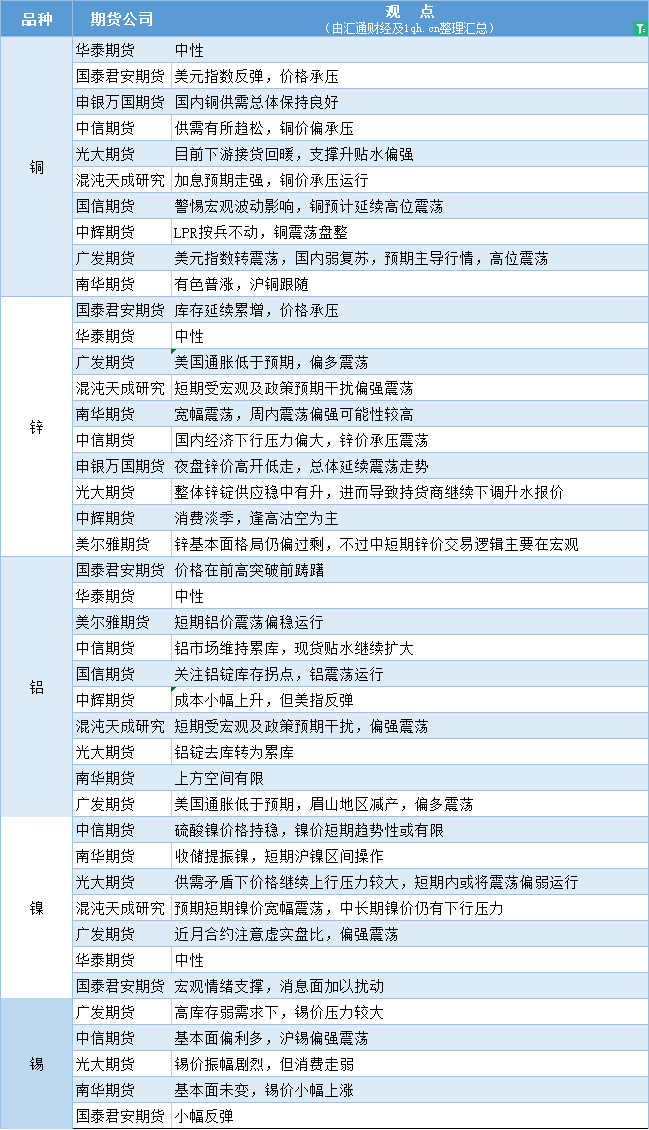 标题:期货公司观点汇总一张图:7月21日有色系(铜、锌、铝、镍、锡等)