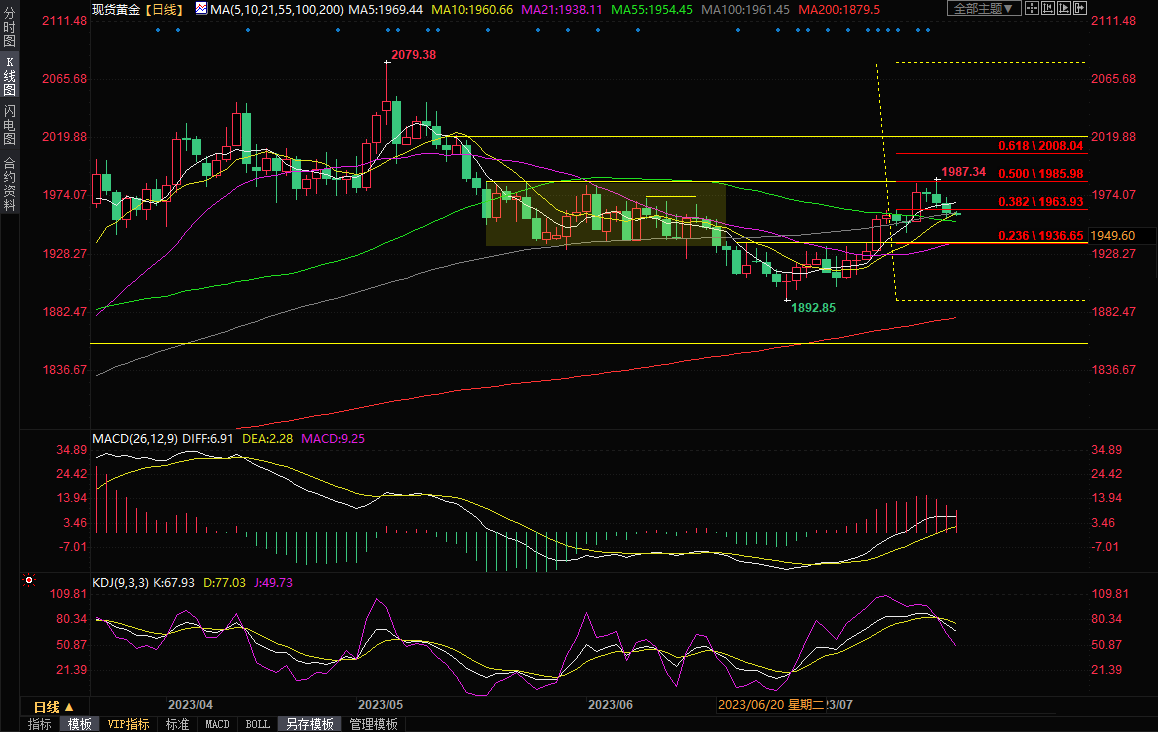 现货黄金窄幅震荡,目前交投于1961.20美元/盎司附近;上周五金价下跌,为日线连续三个交易日下跌,因美国就业数据向好,打压了美联储接近结束加息周期的预期,