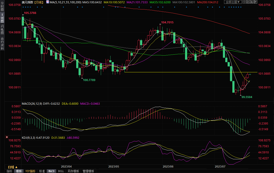 上周四出炉的美国初请失业金人数低于市场预期,也打压了美联储本周释放鸽派论调的可能性,美元指数持续反弹,上周五最高触及101.19,为7月12日以来新高,收报101.09,涨幅约0.26%,为连续四个交易日上涨。美联储和欧洲央行将于本周召开会议,市场预计二者均将加息25个基点。