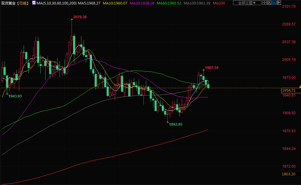 商品收盘情况:美国期金收低0.2%,报每盎司1962.20美元。