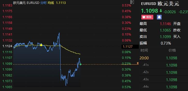 欧元兑美元创7月12日以来新低至1.1065,短线跳水近70点;