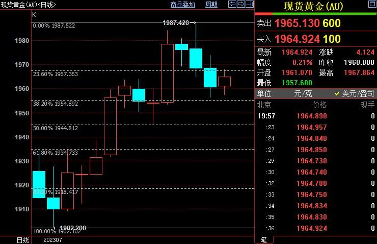 现货黄金上涨0.15%至1964.74美元/盎司;COMEX期金主力合约上浮0.01%至1966.7美元/盎司;