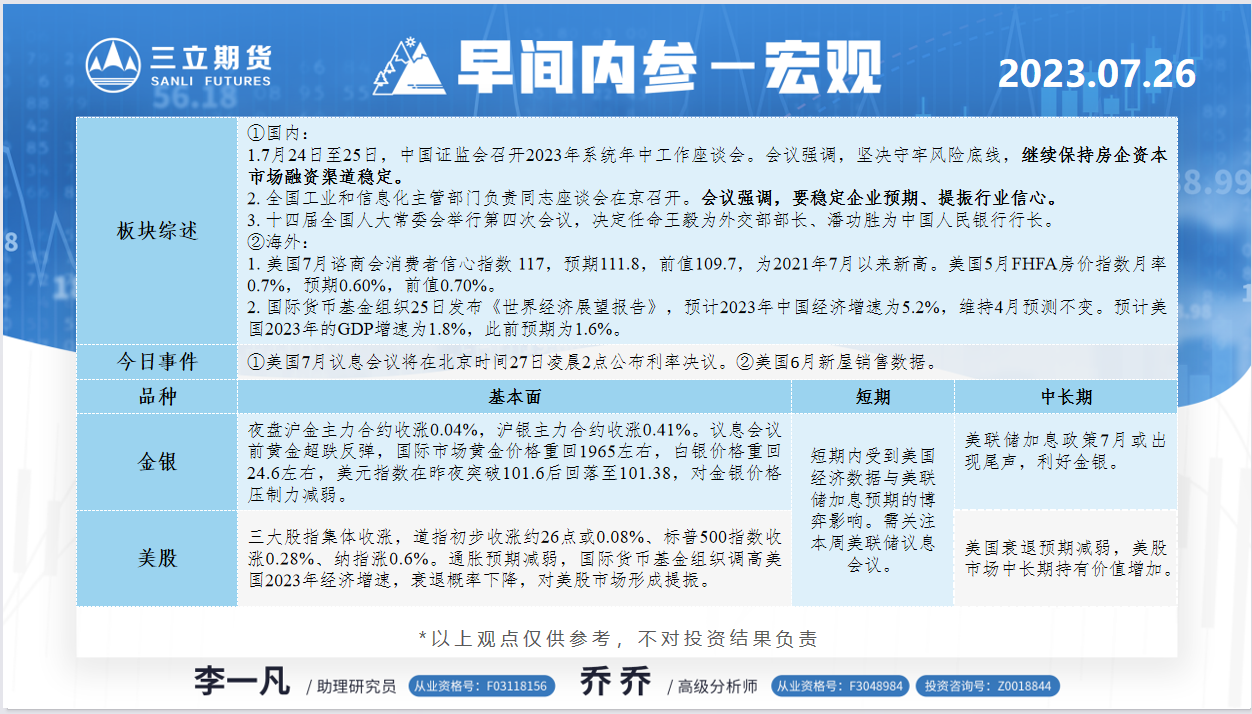 标题:三立期货7月26日早间内参——宏观