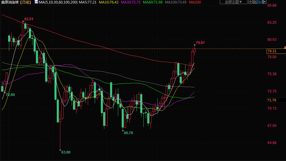 布伦特原油期货结算价涨0.9美元,报每桶83.64美元,盘中一度触及83.87美元,为4月19日以来最高。美国原油期货上涨0.89美元,结算价报每桶79.63美元,盘中早些时候升至每桶79.90美元,为4月19日以来最高。