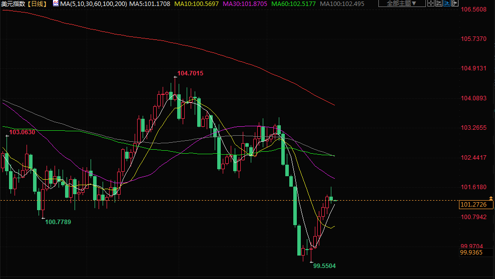 美元指数下跌0.108%,至101.280,此前触及两周高点101.65。