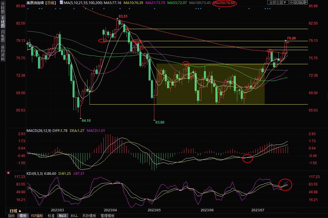 短线的话,4月26日高点79.15附近还存在较强的阻力,3月31日-4月1日的缺口上沿阻力也在该位置附近,短线需要提防有吗小幅回调的可能性,下方初步支撑参考4月26日高点77.90附近位置,7月13日高点支撑在77.31附近,200日均线目前在76.66附近,该位置已经转化为强支撑所在,若意外回落至该位置下方,则增加后市看空信号。