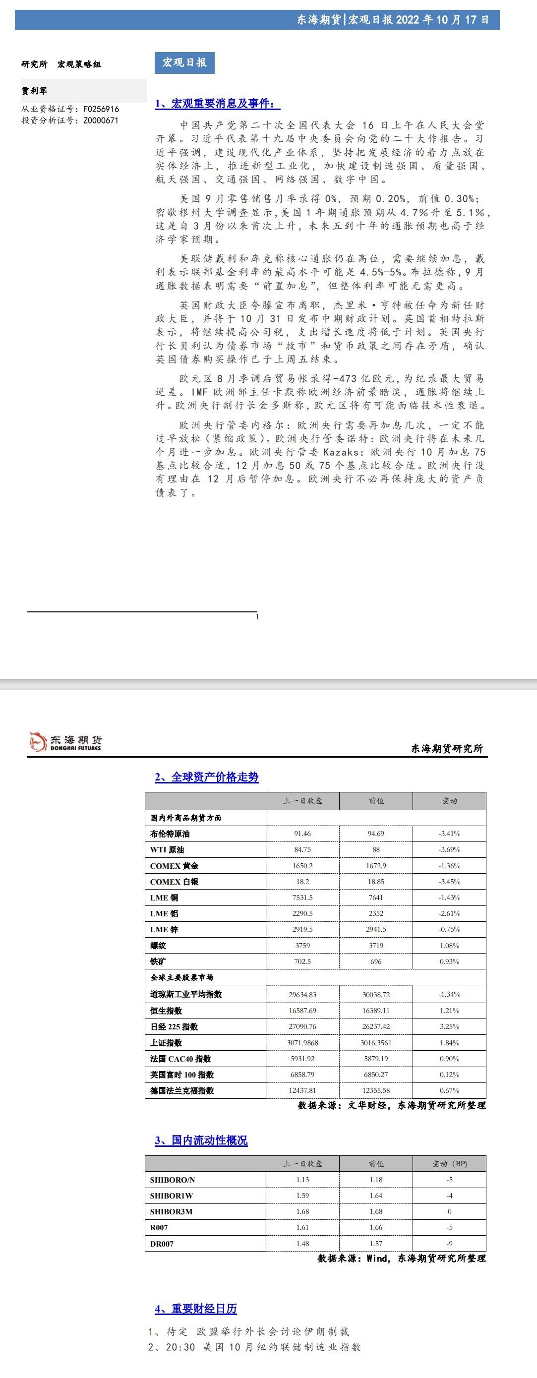 标题:【东海期货10月17日宏观日报】:美元再次大幅走强,风险资产大幅回落