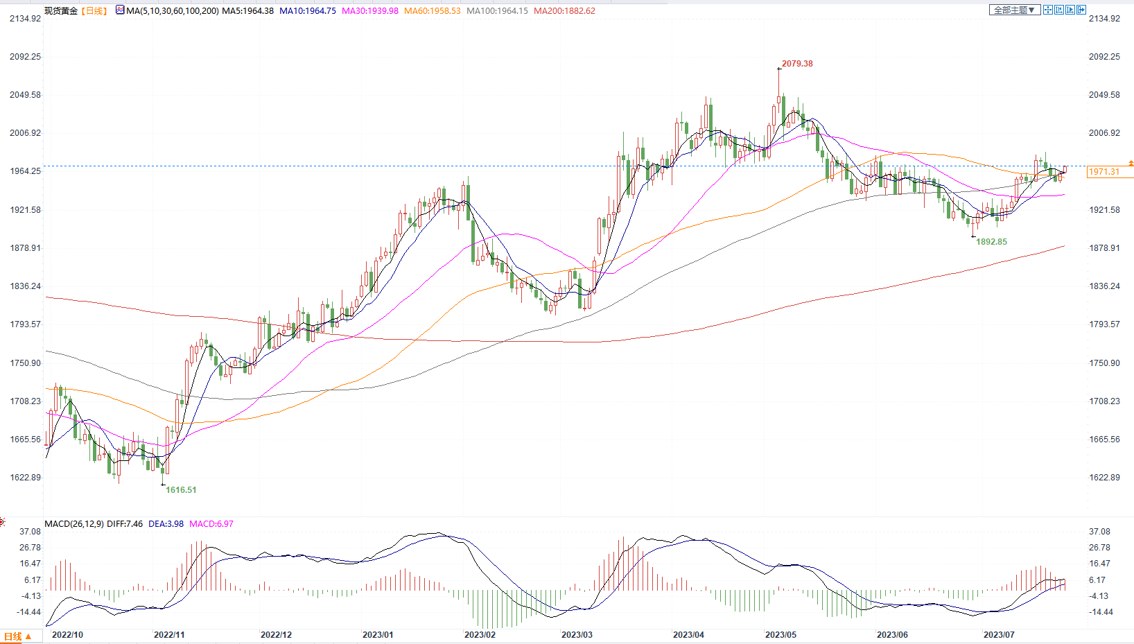 美元指数回落。美国上周初请失业金人数为22.8万人,创2个月来新低,预期24.2万人,前值23.7万人;四周均值23.75万人,前值24.675万人;至7月8日当周续请失业金人数175.4万人,预期172.9万人,前值自172.9万人修正至172.1万人。此前公布的系列经济数据均在表示美国的通胀压力正在明显缓和,市场利多金价的情绪有所消化。预计短期内金银或暂维持偏强震荡,后续重点关注美联储7月FOMC会议决议。操作上建议,逢回调买入为主。