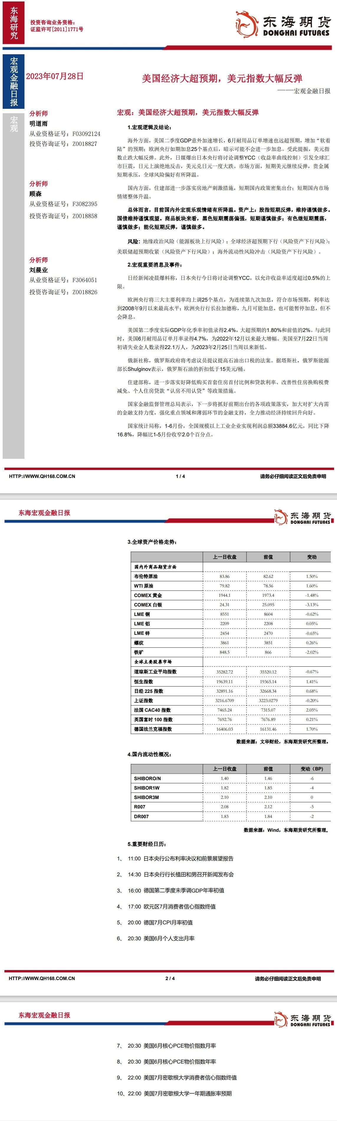 标题:【东海期货7月28日宏观金融日报】:美国经济大超预期,美元指数大幅反弹