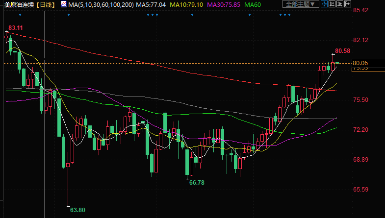 美原油交投于79.61美元/桶附近;油价周四收高,美油一度自4月20日以来首次站上80美元/桶,受OPEC+减产后供应紧张以及需求和全球经济增长前景再度出现利多因素的支撑。