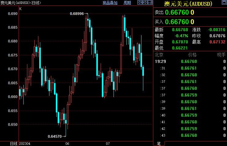 澳元兑美元下跌0.89%至0.6671。除了美元走强,本周公布的澳大利亚第二季度消费者物价指数(CPI)数据也拖累澳元走低,因为该数据显示通胀超预期放缓。澳洲联储下周料将再度升息25个基点,然后在今年剩余时间按兵不动。