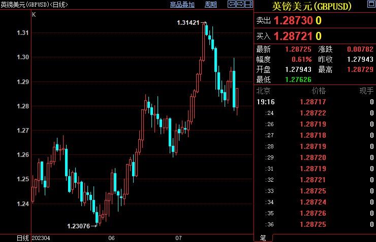 英镑兑美元交投与1.2857附近,本周几乎持稳,但累计波动230多点。尽管美元上涨施压英镑,但英国央行下周几乎肯定升息25个基点至5.25%,并且由于通胀高企,意外升息50个基点的情况不能排除。