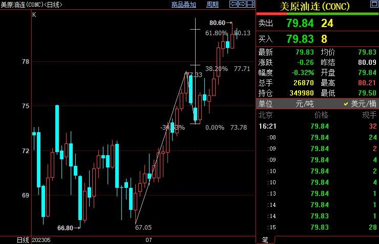 北京时间16:22,NYMEX原油期货下跌0.30%至79.86美元/桶;ICE
