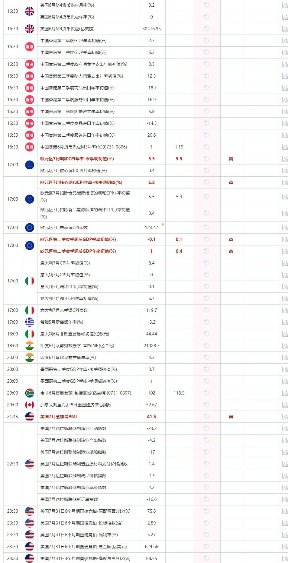 17:00 欧元区第二季度季调后GDP年率初值(%) , 前值 1 , 预期值 0.4 , 公布值:待发布17:00 意大利7月CPI年率初值(%) , 前值 6.4 , 预期值 -- , 公布值:待发布