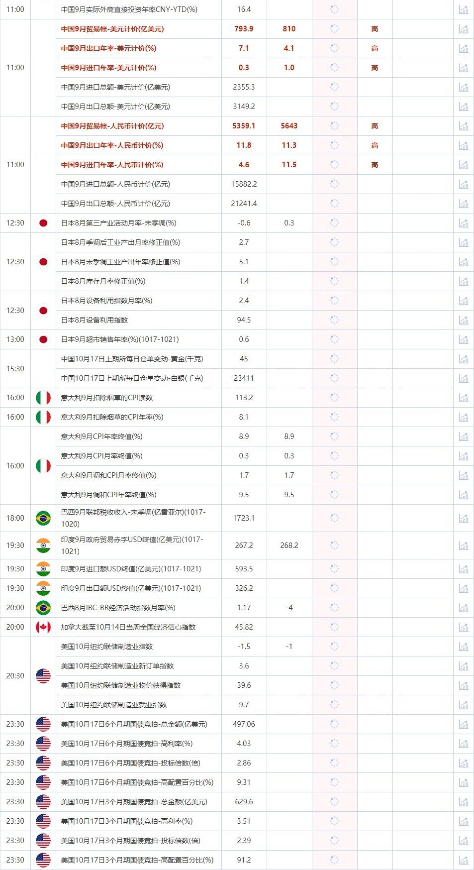 11:00 中国9月贸易帐-人民币计价(亿元) , 前值 5359.1 , 预期值 5643 , 公布值:待发布11:00 中国9月出口年率-人民币计价(%) , 前值 11.8 , 预期值 11.3 , 公布值:待发布11:00 中国9月进口年率-人民币计价(%) , 前值 4.6 , 预期值 11.5 , 公布值:待发布11:00 中国9月进口总额-人民币计价(亿元) , 前值 15882.2 , 预期值 -- , 公布值:待发布